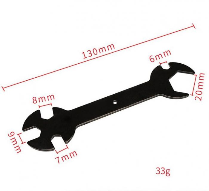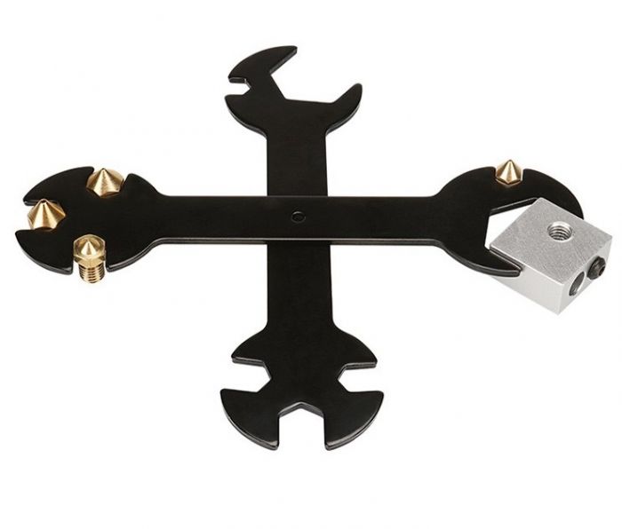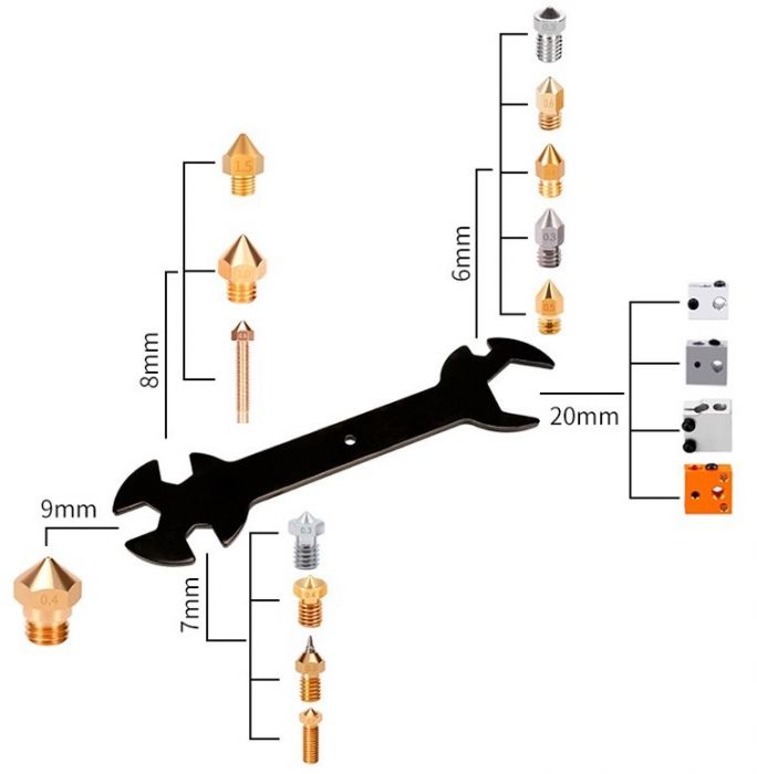 This versatile 3D printer spanner features five open-end sizes (6mm, 7mm, 8mm, 10mm, and 20.2mm) designed for quick nozzle changes on V6, MK8, and MK10 hotends.