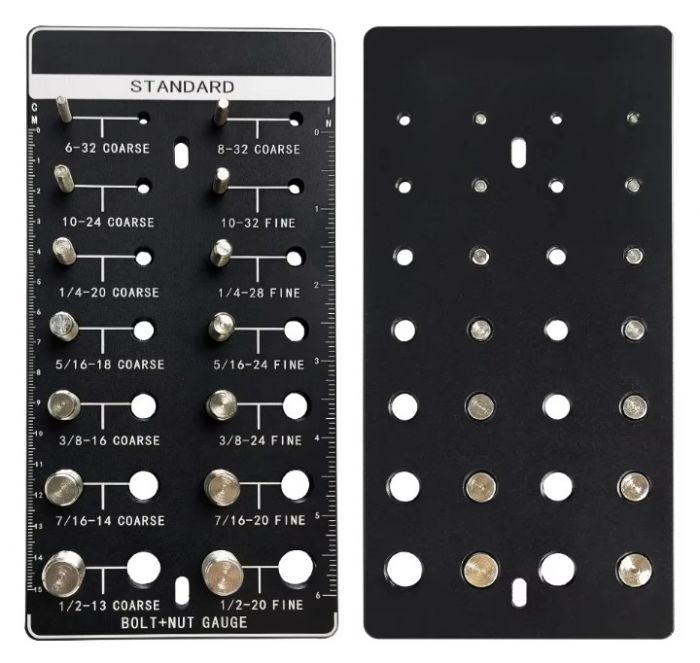 IMPERIAL: 28 Thread Checker bolt & nut gauge board can recognize 14 Imperial thread sizes: 6 gauge - 1/2" ( 6-32, 8-32, 10-24, 10-32, 1/4-20, 1/4-28, 5/16-18, 5/16-24, 3/8-16, 3/8-24, 7/16-14, 7/16-20, 1/2-13, 1/2-20 )
