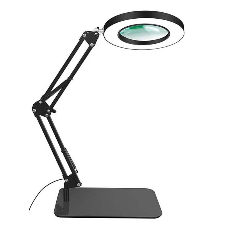 Versatile 2-in-1 magnifying lamp with flexible stand or clamp mounting for any workspace. Features an 8x magnification glass lens (128mm diameter) paired with a 200mm LED light for crystal-clear detail work. Dimmable brightness from 10-100% via convenient button control. Perfect for sewing, drawing, jewellery work and precision tasks. Sleek black finish with USB power connection.