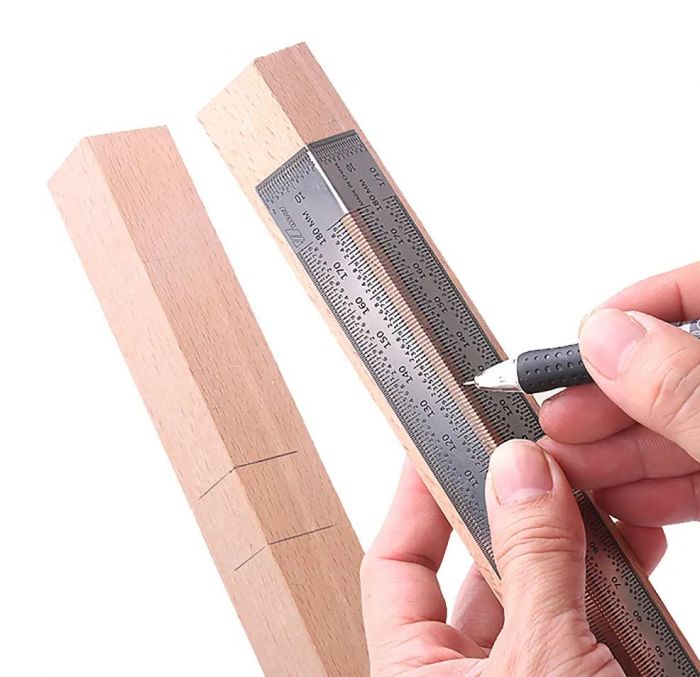 180mm Stainless Steel Precision Ruler for Woodworking. Useful for positioning and scribing on wood tenon and mortising. Marking holes every 0.5mm and 1mm to instantly locate your sharp pencil point or scribe exactly on target with zero uncertainty.