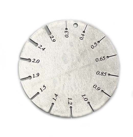 WG85NM-7.94 Diameter 85mm x 2mm Thick, US Number 0 ~ 36 ( 0.0001") on one side, Equivalent metric 0.20mm ~ 7.94mm on the other side.